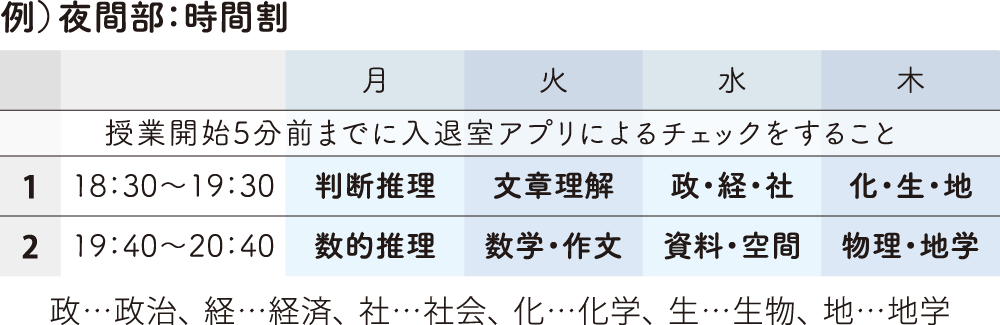 午後6時30分からの授業なので、部活動や仕事を終えてから通学することが可能です。